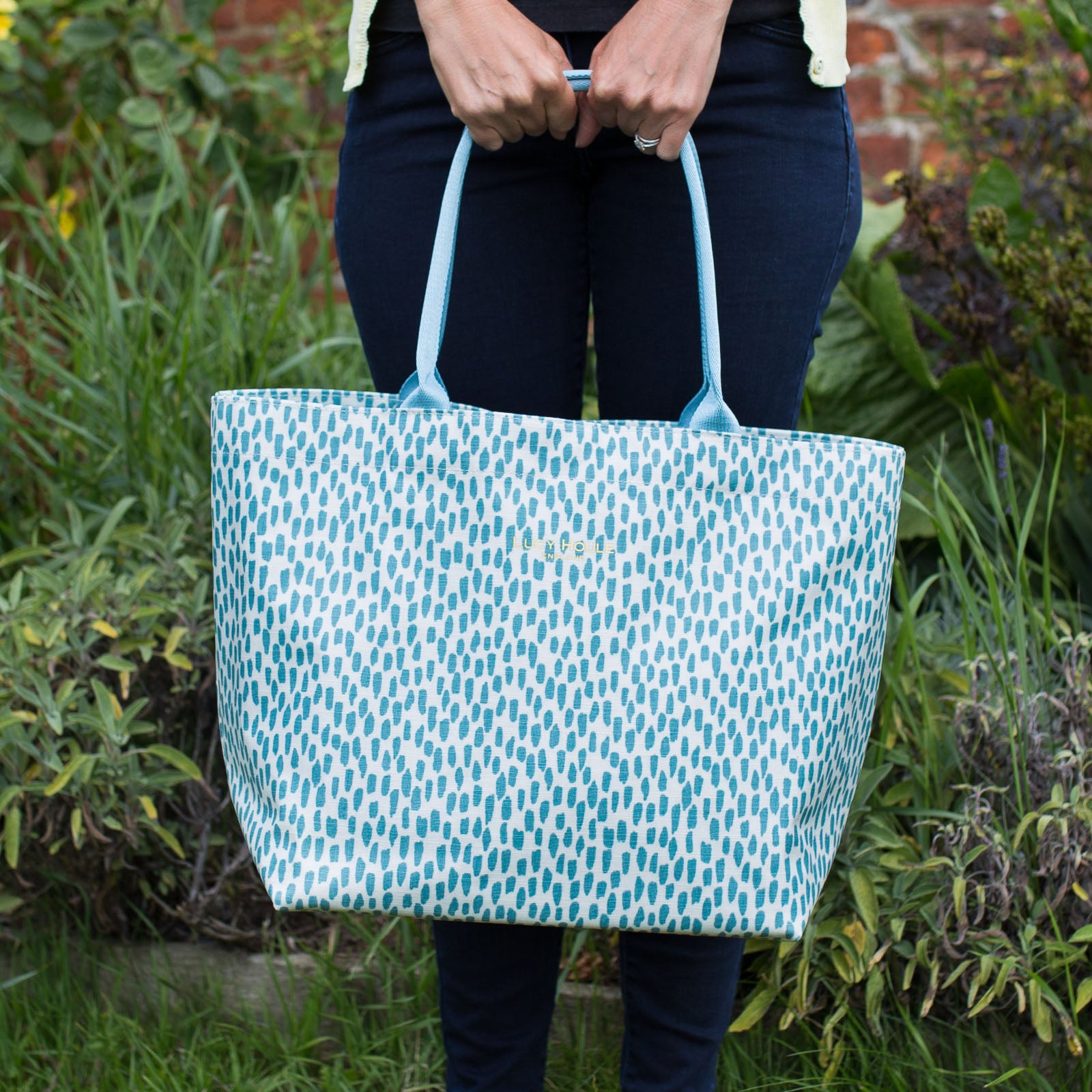 The tote bag has an oilcloth lining with a single pocket, ideal for a mobile phone, keys and accessories and has a removal oilcloth covered base at the bottom of the bag.