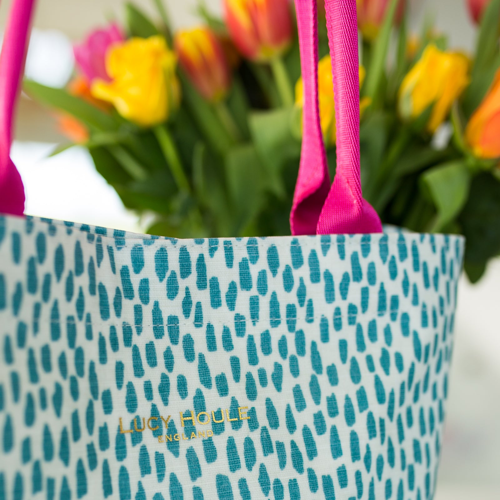 The Small Tote Bag is a great size, for any age, anywhere! This ever popular bag has an oilcloth lining and has an inside pocket and a magnetic closure with hot pink handles.