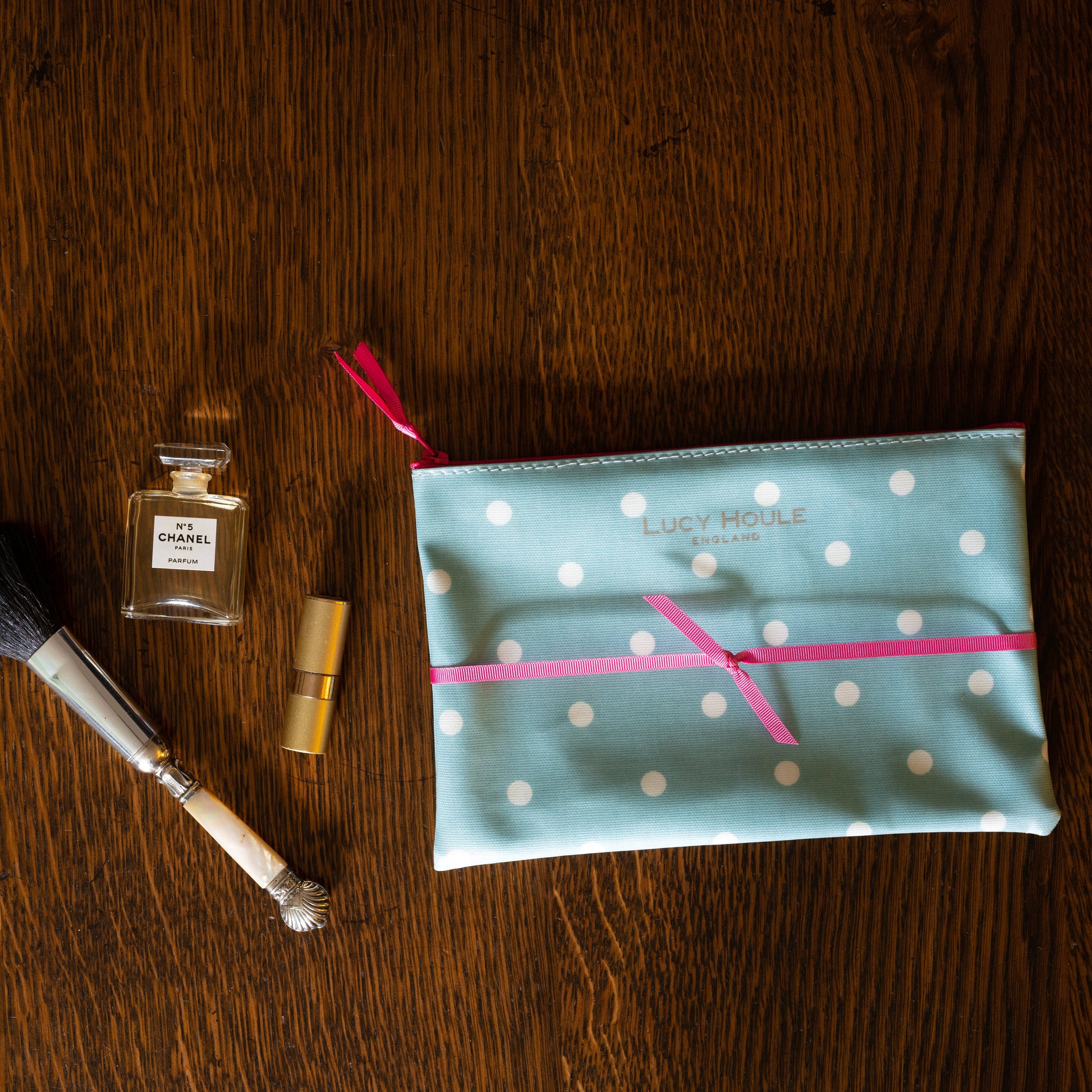 Duck Egg Blue Spot Make-Up Bag with Pink Zip