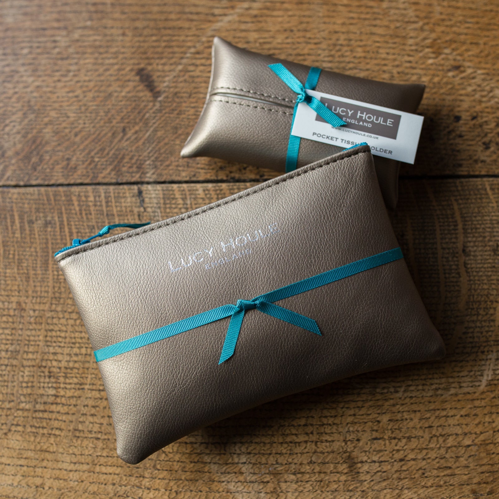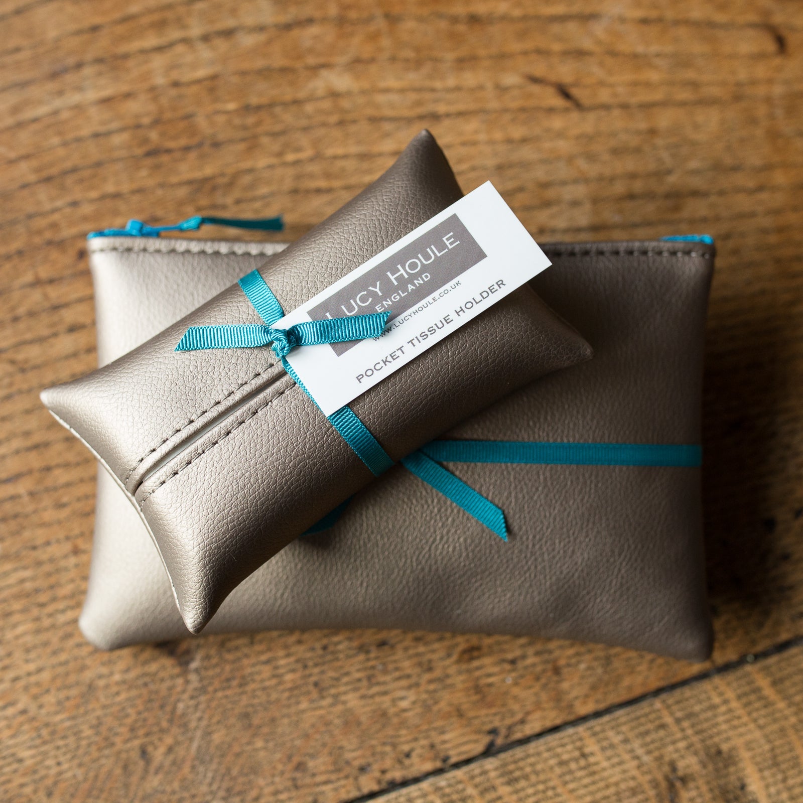 Faux Leather Pocket Tissue Holder Contains 10 pocket tissues and hand tied with ribbon.