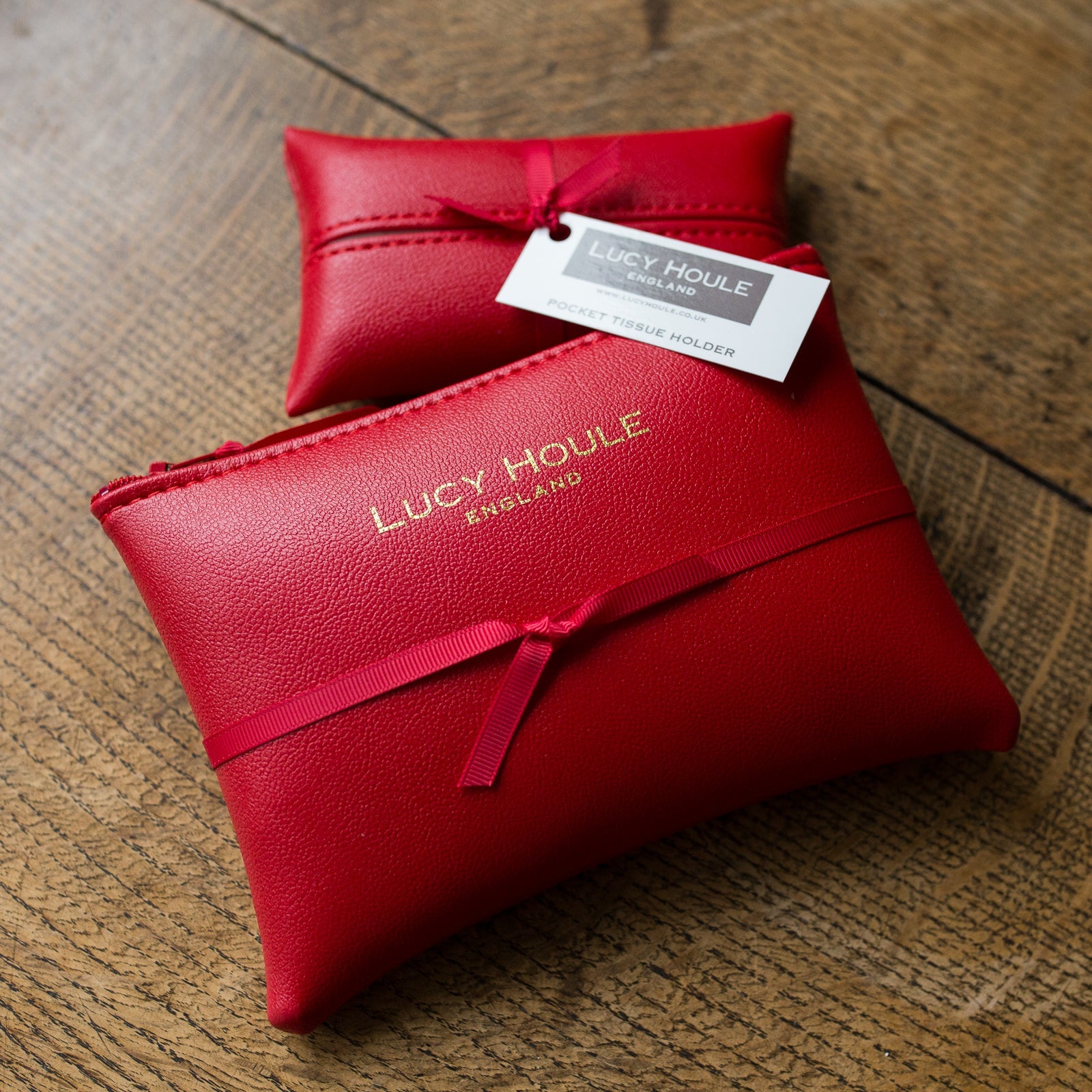 Faux Leather Pocket Tissue Holder Contains 10 pocket tissues and hand tied with ribbon.