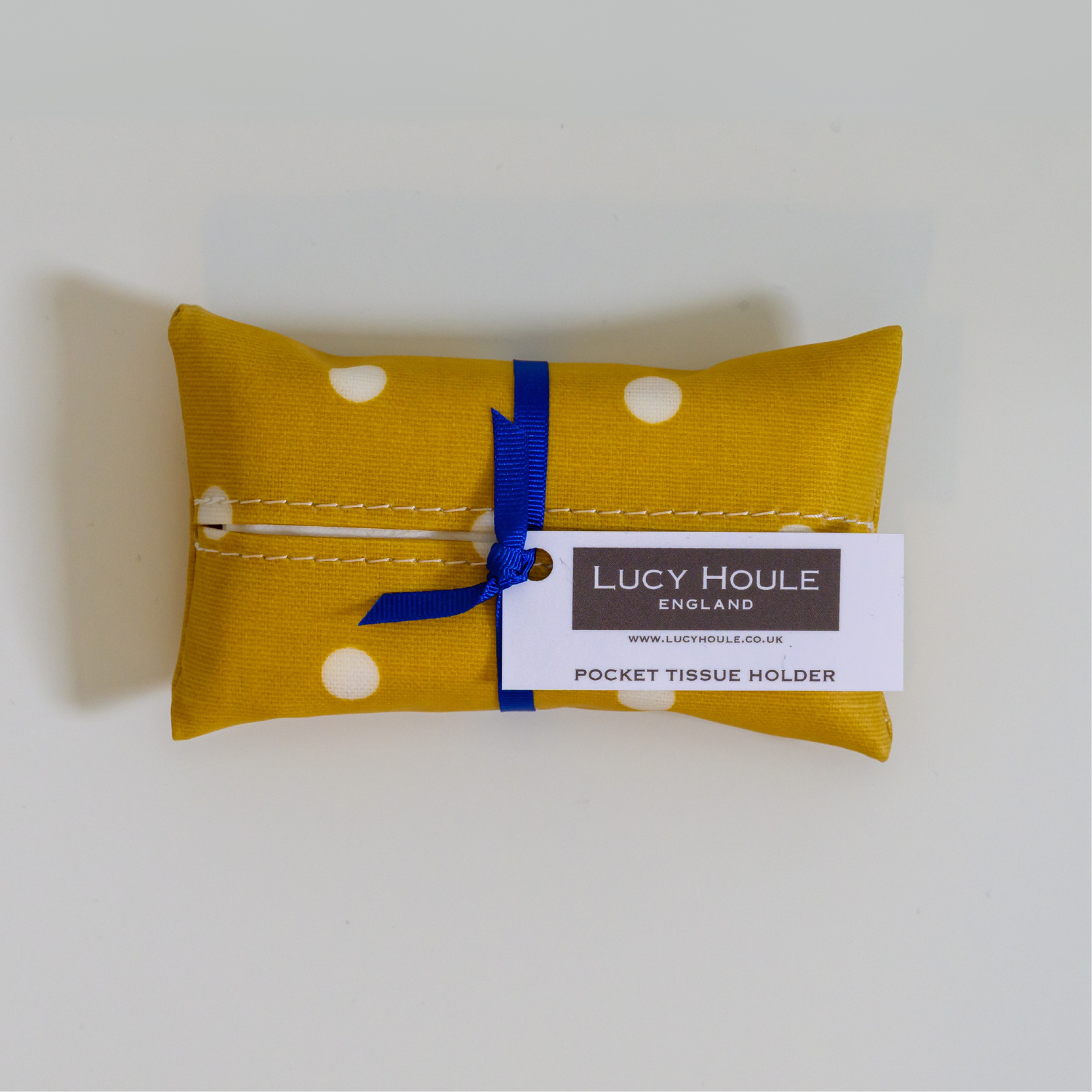 Handmade in England in easy clean oilcloth and are refillable. Contains 10 pocket size tissues and hand tied with ribbon.