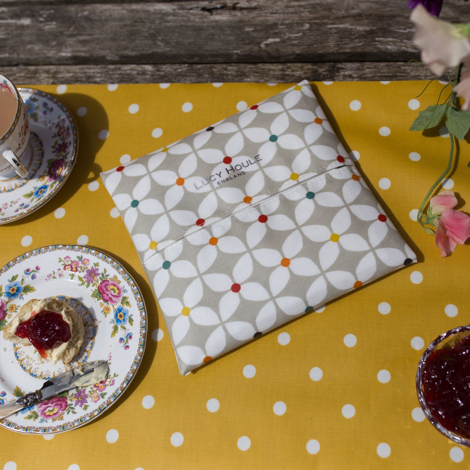 Handmade in easy clean oilcloth and is refillable. Contains 20 white paper napkins. Fits 33cm x 33cm paper napkins.